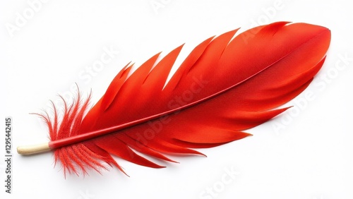 A vibrant red feather with a smooth texture and detailed barbs, resembling chicken feathers.