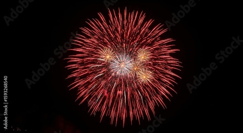 A vibrant red firework explodes in the night sky, creating a dazzling spectacle of light and color