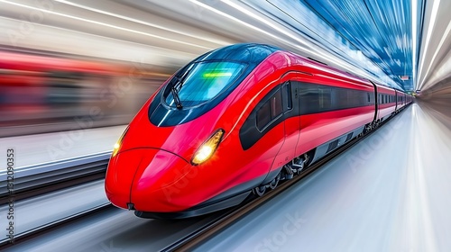 A vibrant red high-speed train accelerates through a modern urban station with a dynamic blurred background showcasing technology and movement.