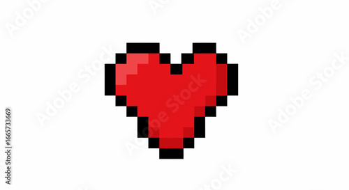 A vibrant red pixel art heart with a black outline, digitally rendered on a clean white background, evoking retro video game aesthetics.