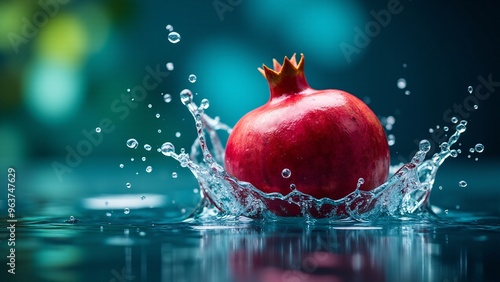 A vibrant red pomegranate splashes into water, with droplets and seeds captured mid-motion against a blurred teal background