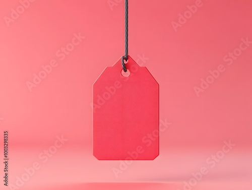 A vibrant red price tag hanging against a soft pink background, perfect for marking discounts and sales.