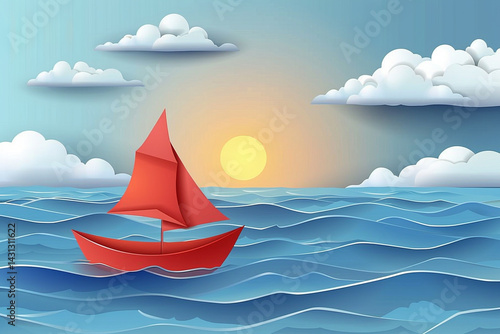 A vibrant red sailboat sails across the blue ocean towards the setting sun, under a cloudy sky.