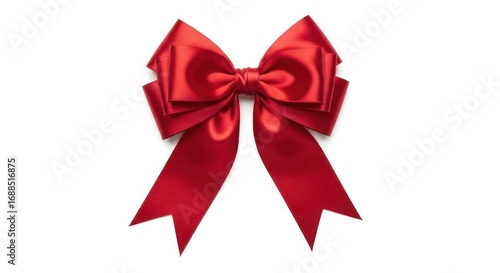 A vibrant red satin ribbon bow, elegantly tied with sharp points, isolated on a pure white background.