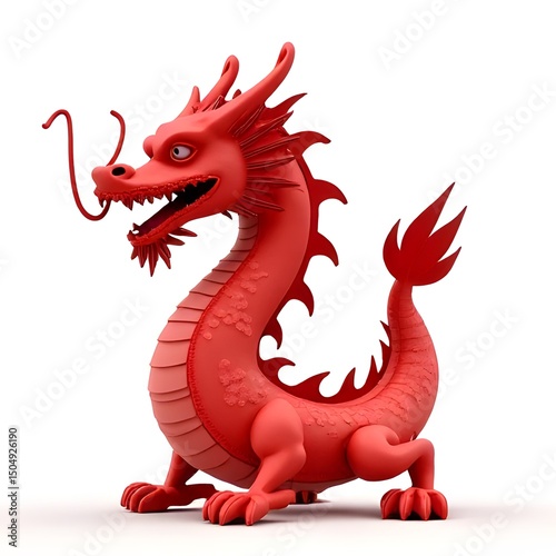 A vibrant red, stylized dragon drawing features intricate details and a playful expression set against a stark white background, evoking imagination