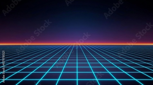 A vibrant retro background featuring a grid pattern against a neon horizon, ideal for digital designs, tech projects, and futuristic themes.