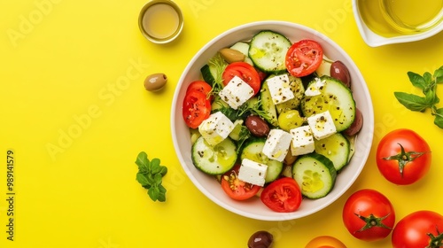 A vibrant salad featuring cucumbers, tomatoes, olives, and feta cheese on a bright yellow background.