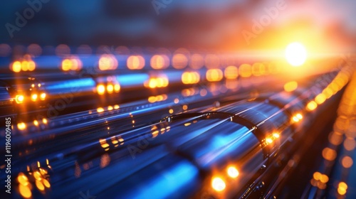 A vibrant scene featuring illuminated metallic pipes, bathed in warm light, creating a dynamic interplay of colors and reflections.