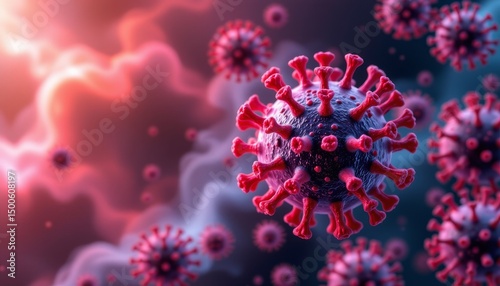 a vibrant scene of a molecular structure, resembling a virus particle with a spiky surface, set against an abstract backdrop with