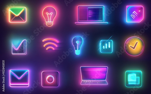 A vibrant set of matte UI icons in glassmorphism style, incorporating soft, blurred neon gradients, with icons like a notification bell, light bulb, laptop, web settings, percent discount