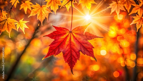 A Vibrant Single Maple Leaf Illuminated by the Golden Rays of the Setting Sun, Framed by a Blurred Background of Autumn Foliage