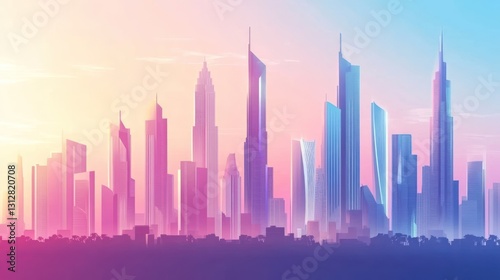 A vibrant skyline at sunset, showcasing modern skyscrapers in gradient colors.