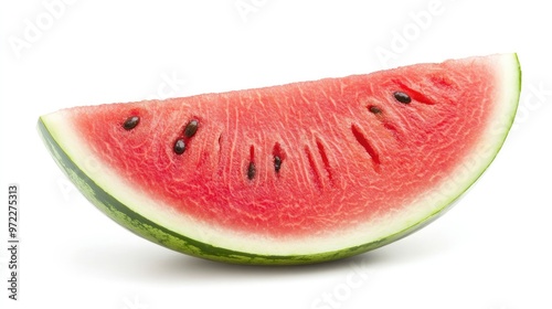 A vibrant slice of watermelon with juicy red flesh and green rind, isolated on a clean white background