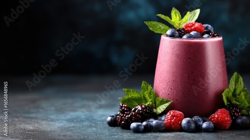 A vibrant smoothie made from assorted berries rests elegantly on a dark background, surrounded by fresh fruits and mint, capturing a sense of health and flavor.