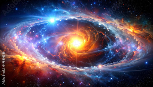 A vibrant spiral galaxy, swirling stars and nebulas around a bright central core in deep space.