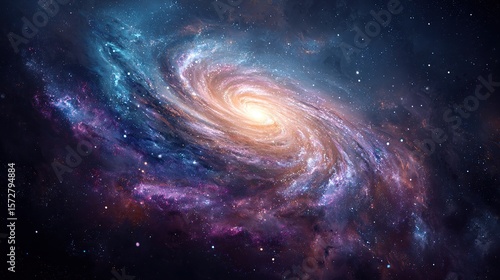 A vibrant spiral galaxy swirls with blues, purples, and oranges, its core glowing brightly against a backdrop of scattered stars and dark nebulae