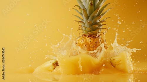 A vibrant splash of pineapple juice captured mid-air against a solid yellow backdrop.
