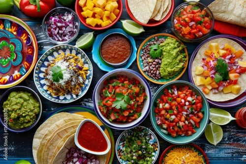 A vibrant spread of taco ingredients and toppings for a festive meal.