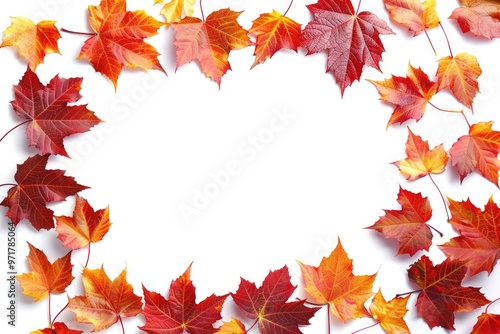 A vibrant square frame of exquisite autumn leaves captured against a pristine white background, showcasing the warm colors of fall in red, orange, and yellow tones
