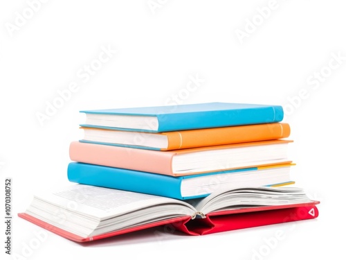 A vibrant stack of assorted hardback books in various colors, isolated on a white background, perfect for educational and creative design projects, digital media, education
