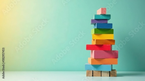 A vibrant stack of colorful wooden blocks against a pastel green background, representing growth, balance, and creativity