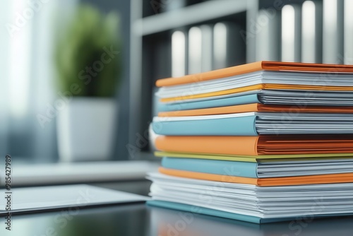 A vibrant stack of organized documents with colorful covers, set against a modern office background with greenery.