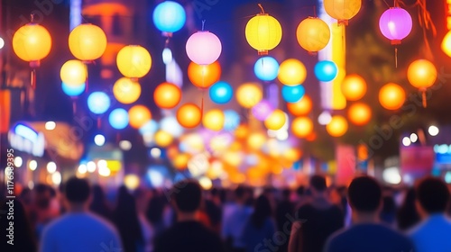 A vibrant street scene illuminated by colorful lanterns, filled with people enjoying the atmosphere.