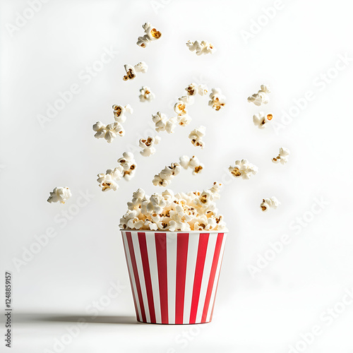 A vibrant studio shot capturing the joyous explosion of popcorn from a classic striped container against a clean white backdrop for cinema treat