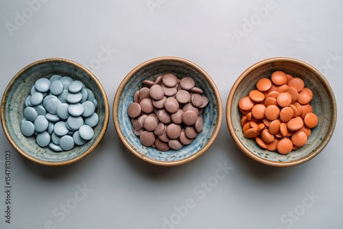 A vibrant studio shot featuring three ceramic bowls filled with colorful chocolate chips, arranged symmetrically on a clean grey background.