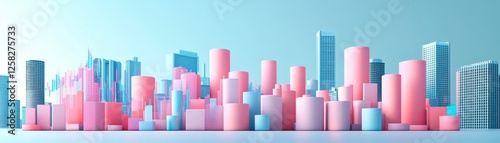 A vibrant, stylized city skyline featuring colorful buildings in soft pinks and blues against a light background.