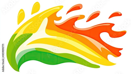 A vibrant, stylized illustration of a colorful liquid explosion or splash, featuring gradients of yellow, orange, and red. A green leaf-like element is subtly integrated into the design