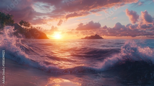 A vibrant sunrise casts warm light on a tranquil beach scene with gentle waves crashing on the shore.