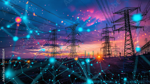 A Vibrant Sunset Backdrop Highlights Power Transmission Towers and Electrical Lines Amidst a Network of Glowing Connections in a Rural Landscape