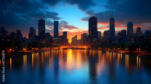 A vibrant sunset illuminates the Chicago skyline, reflecting in the calm waters of a lake.