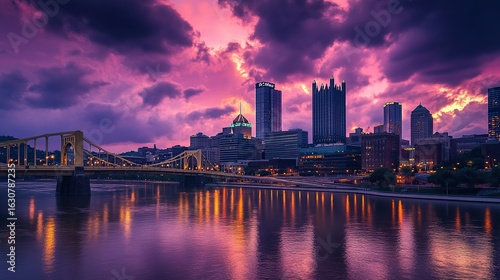 A vibrant sunset paints the Pittsburgh skyline, reflecting on the water, showcasing a mix of modern architecture and natural beauty.
