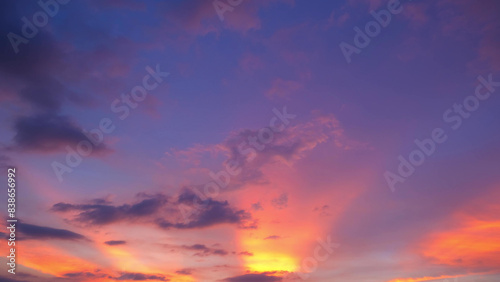 A vibrant sunset with a stunning blend of pink, orange, and purple hues. Dark clouds create a dramatic contrast, while the light rays give the sky a mesmerizing glow. Sunset sky background.