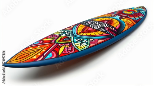A vibrant surfboard with artistic patterns, isolated on a white background.
