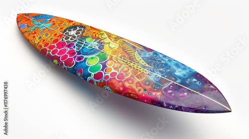 A vibrant surfboard with artistic patterns, isolated on a white background.