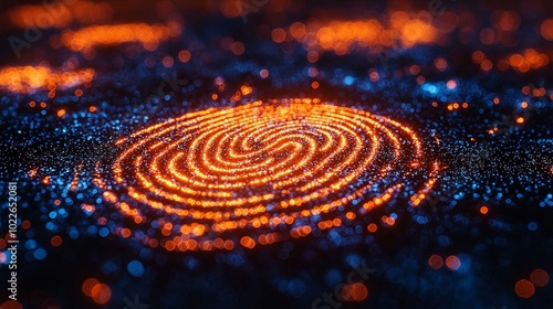 A vibrant swirl of orange and blue particles resembling a galaxy or fingerprint.