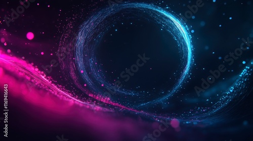 A vibrant, swirling abstract design featuring blue and pink hues against a dark background, evoking a sense of movement and energy.