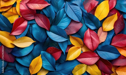 A vibrant tapestry of yellow, red, and blue autumn leaves creates a colorful background.