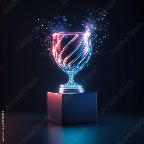 A vibrant trophy glowing with colorful lights and sparkles, representing achievement and celebration in a dark setting.