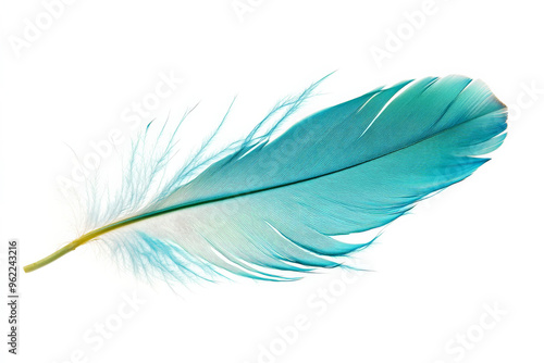 A vibrant turquoise feather with sharp, intricate barbs, floating gracefully against a clean white backdrop.