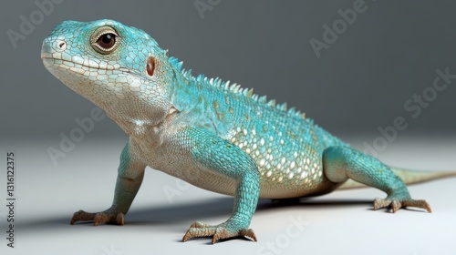 A vibrant turquoise lizard poses confidently against a minimalist backdrop, highlighting its striking scales and alert posture.