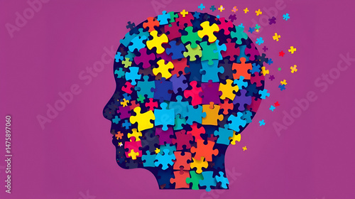 a vibrant vector illustration of a human head created entirely from tiny interlocking puzzle pieces. ADHD and the complexities of mental health