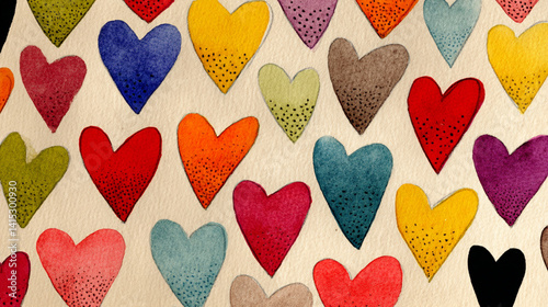 A vibrant watercolor pattern featuring various colorful hearts on a light background, showcasing a playful and artistic design.