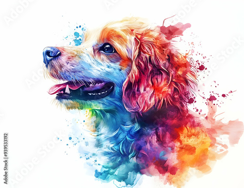 A vibrant watercolor portrait of a joyful dog, filled with colorful splashes and capturing the essence of canine happiness.