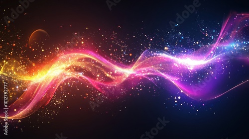 A vibrant wave of colorful light swirls through a dark background, embodying energy and movement with sparkling particles.
