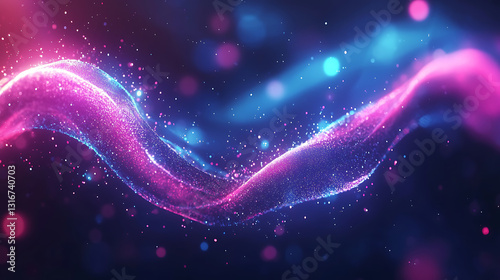 A vibrant wave of pink and blue particles flows across a dark background sprinkled with bokeh lights and subtle glows.