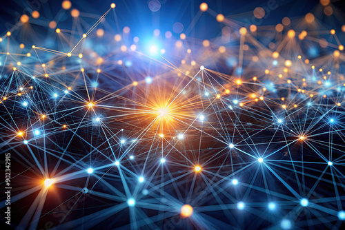 A vibrant web of interconnected nodes and lines creating a digital network, symbolizing technology, communication, and data exchange.